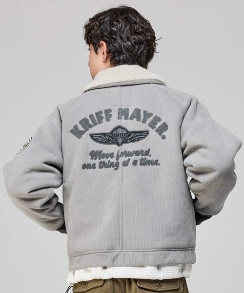 ヴィンテージにはない軽さと柔らかさ、暖かさを両立させたボンバージャケットです。コーデュロイ素材とボア素材をボンディングした柔らかく軽量で暖かいオリジナル素材を使用しています。背面にはフライトジャケット風のアップリケと刺繍、袖にはワッペンが取り付けられたコーディネートの主役になれるアイテムです。こちらのアイテムは同デザインのドッグウェア(品番:D2525113)も展開していますので、ワンちゃんとお揃いコーデが楽しめます。-------------------------シルエット:ややワイド生地の厚さ:中肉透け感:なし伸縮性:なし裏地:ありケア方法:洗濯機洗い可(ネット使用)-------------------------●KRIFF MAYER(クリフメイヤー)家族みんなの毎日に楽しさと笑顔をお届けしたい。クリフメイヤーの服にはそんな思いがたくさん詰め込まれています。メンズ・レディース・キッズ、更にドッグウェアまで展開。何気ない日々が特別な思い出に変わる瞬間を演出する、ベーシックかつオリジナリティーあふれる新しいデイリーウエアを提案します。