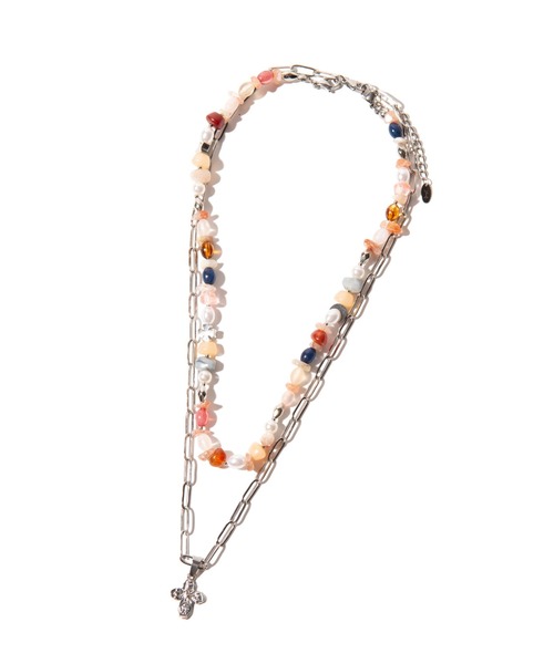 ハードコアとピースフル、2つの異なるムードを組み合わせてリリースするMulti Material Necklace。天然石と有機的なパール、スターモチーフを組み合わせたビーズネックレスとステンレスチェーンのクロスネックレスを重ねた2連デザイン。シングルでもダブルでもスタイルを引き立てるアレンジ自在の仕様はアクセサリーに挑戦したい方にもおすすめとなっております。