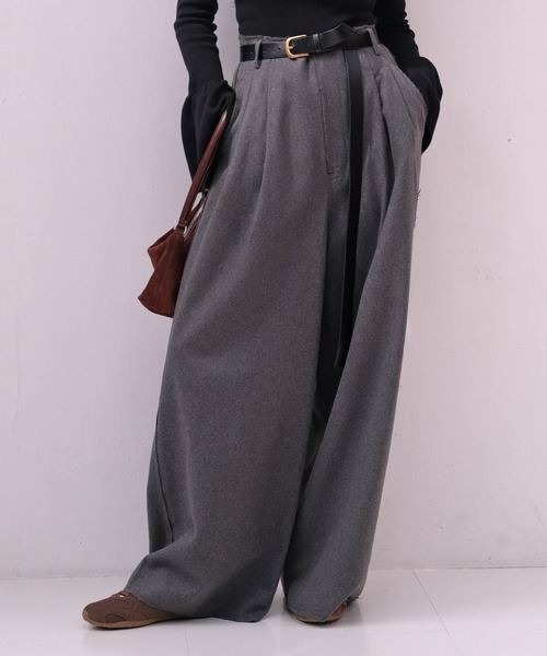 表情のあるネップ素材や太めなシルエットが大人顔のワイドパンツネップが入ったウールライクな生地を使用した、存在感のあるワイドパンツ。ワイドシルエットはマニッシュさがありながら、すとんとした落ち感がエレガントな雰囲気に。ハイウエストのすっきりとした腰周りに、フロントタックで立体感を加えたシルエットが、スタイルアップ効果抜群です。各所に施したカットオフ仕様は、ナチュラルなニュアンス感のあるアクセントに。シャツやブラウスできれいめスタイルから、スウェットなどのカジュアルスタイルまで、トップスを選ばず着回しできる一枚です。通勤、通学はもちろん、オフィスシーンや普段使いにもおすすめ。---------------------------------透け感:なし裏地:あり伸縮性:なし光沢感:なし生地の厚さ:普通---------------------------------▼お取り扱い上の注意※お手入れの際は商品の縫込みネーム・アテンションを必ずご確認ください。家庭洗濯〇(40℃限度。手洗いのみ)漂白×タンブル乾燥×日陰でのぬれ平干しアイロン〇(中温150℃まで)ドライクリーニング〇(弱い処理。石油系溶剤)ウェットクリーニング〇(非常に弱い処理)・ネット使用、もしくは裏返ししてお洗い下さい。・素材の性質上、多少収縮する可能性があります。洗濯後、形を整えて干して下さい。なお自動乾燥機(タンブラー)の御使用はおさけ下さい。・アイロンは裏側からあてて下さい。・アイロン時はあて布をして下さい。・この製品は、洗濯の際、多少の色落ちします。他のものと別に洗って下さい。この製品は、ファッション性を重視して部分的に裁ち切り始末にしています。裁ち切り部分に強い力が加わったり、着用や洗濯・クリーニングなどで、ほつれた状態が進行することがあります。ほつれが長くなった場合は、引っ張らずにハサミで丁寧に切り取って下さい。濃色の製品は摩擦(特に湿った状態での摩擦)や、汗や雨などで濡れた時は他の衣料や下着(特に白物)に色移りする場合がありますので、十分ご注意下さい。お洗濯/クリーニングの際は、色落ちすることがありますので、単品洗いをおすすめします。また、他の淡色物に色移りすることがありますので、すみやかに処理(脱水・乾燥)するようお願いいたします。以上の点を十分ご留意の上、お取扱い下さい。