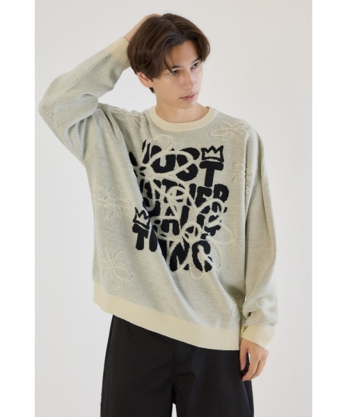 AUTUMN & WINTER ( 秋服 / 冬服 ) ■ポイント 手書き風の柔らかいフォントに、前身頃全体に施した立体感あるフラワーグラフィックがキャッチーなニットトップス。 ■ディテール フラワー部分をパイル編みする事で立体感が生まれ、温かみのある雰囲気に仕上げました。 ■スタイリング シンプルなデニムと合わせてニットのデザインを際立たせるスタイルや、インナーにシャツを重ね着し襟や袖を見せて上品さをプラスするのもGOOD。 ユニセックスデザインなので、カップルや友達同士で合わせるのもおすすめです。 ■生地 ※手洗い対応 ※ONE&ONLY札付き ストレート糸とループ糸を組み合わせたジャガード編みの特性上、編地表面にネップや糸の浮きが生じることがあります。 また、ループ部分は引っ掛けやすいため、取り扱いにはご注意ください。 着用を重ねると毛玉や毛羽立ちが出る場合がありますが、素材の特性上避けられませんのでご了承ください。 また、ロゴ部分はシングルジャガード編みのため、ループロゴ部分に小さな穴のような編地が見られる場合があります。 こちらもニットの編み工程上の仕様であり、不良品ではございません。 ピリングなどが発生した場合は、はさみなどできれいにカットしてください。 ナイロン混のテンションのあるニット商品ですので、ハンガー掛けの際に襟元などが伸びます。 サイズ違いの原因にもなりますので、こまめにハンガーから外すなどご注意下さい。 ■透け感:なし ■裏 地:なし ■伸縮性:あり ■光沢感:なし [注意事項] ※画像の商品はサンプルです。実際の商品と仕様、加工が若干異なる場合があります。 ※画像の商品は光の照射や角度、お使いのモニター環境により、実物と色味が異なる場合がございます。 ※着用、お取り扱いの際は、アテンションタグをご確認ください。 ※弊社管理上のカラーを表記しており、タグのカラー表記と異なる記載となっている場合がございます。 ▼商品のお気に入り登録お気に入りアイテムの再入荷・在庫1点などの通知を受け取ることができます。 ▼ブランドのお気に入り登録新作アイテムの入荷や人気アイテムの再入荷、おすすめトピックスなど、いち早くブランドの情報を受け取ることができます。 ※こちらの商品は、RODEO CROWNS WIDE BOWL 独自の採寸方法となっています。本サイトのサイズガイドと採寸方法が異なる場合がありますのでご了承ください。