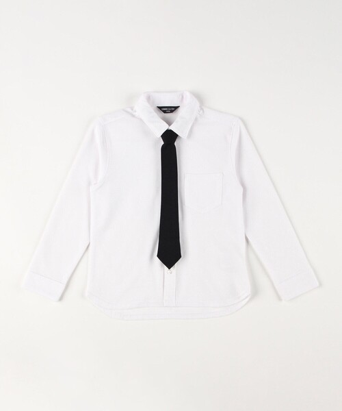 《デザイン》ネクタイが取り外し出来るので、フォーマルからカジュアルまで、幅広くお使い頂ける半袖のベーシックシャツです。ネクタイは表地と同じような表面感のある布帛のオックス素材で黒無地にしていますので冠婚葬祭でも使いやすくなっています。ボタンは、ロゴ入りのものを使用しています。《素材》ポリエステルと綿の糸によるキメの細かいジャージー素材のオックスで、洗濯した後でも乾きやすく、肌触りが良いのが特徴です。伸縮性のよい素材なので、お子様が動きやすく、着心地良く着て頂けます。ご自宅で洗濯機洗い可能です。