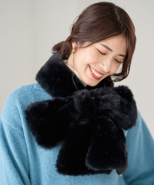 リボンの形をしたフェイクファーティペット。かわいらしいデザインで、コーディネートに華やかさを添えるアイテム。暖かさもあり、冬のおしゃれアイテム。