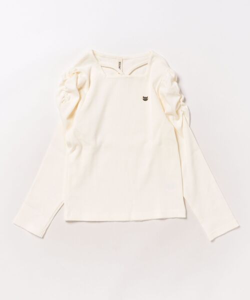 [90-120もあります] テレコ素材を使用しており、伸縮性があるため着心地が良く、体にフィットしやすい仕様になっています。 袖部分にシャーリング加工が施されており、エレガントで女の子らしい印象を与えるデザインになっています。 生地の厚みは普通からやや厚手で、透け感はありません。 ポケット、裏地なし