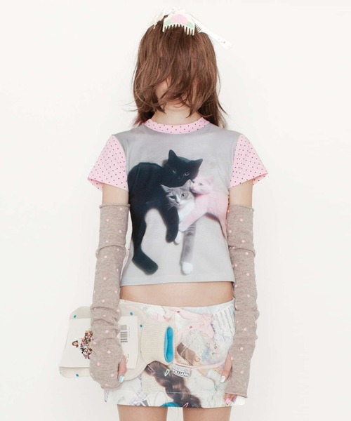 Ashley Williams (アシュリー・ウィリアムズ) KITTEN TRIO T-SHIRT 【Fabric】 ストレッチ性の高いコットン生地。 【Design】 前面猫プリント、袖・首元・背面ドット柄切り替え。タイトフィットデザイン。クロップド丈。 <ABOUT ASHLEY WILLIAMS (アシュリー・ウィリアムズ)> ポップカルチャーとノスタルジーを融合させた、新進気鋭のイギリス人デザイナー。ウェストミンスター大学卒業コレクションにて高い評価を得たアシュリー・ウィリアムズは、ファッション業界の新進人材育成を目的としたロンドン拠点のインキュベーションプログラム「Fashion East」への参加を誘致されました。2シーズンにわたって他のメンバーと共同でデザインを行った後、2015年春にソロデビューを果たしました。 新世紀ポップカルチャーのイメージ、キッチュなノスタルジー、そしてイギリス独特の魅力をエキセントリックに融合させ、同世代のエネルギッシュで反逆的な精神を余すところなく表現します。Tシャツやスウェットには、あけすけなスローガンや故意に誇張されたグラフィックがあしらわれ、バッグやアクセサリーは型破りなディテールで装飾されています。 ※照明等の条件により写真と実際の商品とは色味、サイズ等若干異なる場合があります。予めご了承ください。ご利用いただいているモニターの環境によって色が再現できない場合がございます。