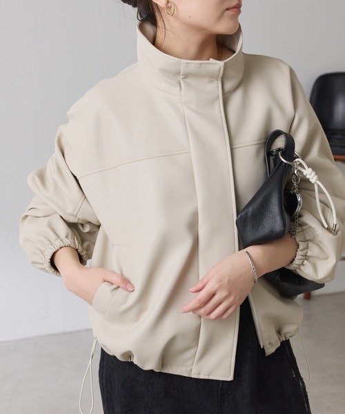 品のあるムードを演出してくれるショートブルゾン色違いで【キャメル(後ろにロゴ刺繍入り) CLZ1052607A0003】がございます。【POINT】・本物のレザーのような滑らかさと光沢感を再現したショートブルゾン。軽さのある着用感もポイント。・ゆったりめの身幅とドロップショルダーで厚手のニットの上からでもラクに着て頂けます。・コンパクトな丈感でフレアスカートやワンピースともバランスが良いです。裾にはドローコード付きでお好みのボリューム感に調節も可能◎・フロントファスナーはダブルジップ仕様で上下の調整ができ、衿元はボタンをはずして高さに変化をつけれます◎【おすすめコーディネート】レースやワンピースなどきれいめアイテムと合わせるとレザーの風合いが高級感をプラスしてくれます。【おすすめのスタイリングアイテム】・リラックススリムパンツ CLS5052102A0001・2WAYレースキャミワンピース CLZ1052609A0003【素材】表地:ポリエステル55%, ポリウレタン45%裏地:ポリエステル100%透け感:なし裏地:あり伸縮性:なし光沢感:なしおすすめ着用時期:秋、春洗濯:ドライクリーニング≪返品・交換について≫・着用後、洗濯後の返品・交換は致しかねます。・商品到着後、着用前に商品状態のご確認をお願い致します。・ECサイトでご購入いただいた商品は、お修理を承っておりません。【気になる商品は「お気に入り」登録を】ハートマークをクリックし、お好きなカラーを選んでお気に入りに登録すると入荷情報や残り1点の通知、完売カラーの再入荷、セール情報などを受け取ることができます。※撮影場所やお使いのモニター環境により若干お色味が異なる場合がございます。特にロケの撮影では明るく見える傾向にございます。詳細撮影画像で色味をお確かめくださいます様お願いいたします。※サンプルで撮影をしております。若干の仕様が変更になる場合がございますので予めご了承の上ご注文くださいますようお願いいたします。※サンプルでの採寸のためあくまで目安となります。予めご了承ください。