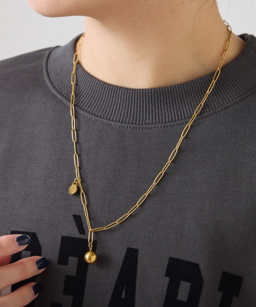 いつものコーデを格上げしてくれるチェーンネックレス【POINT】・ステンレスのロングリンクチェーンにキャッチーなモチーフが付いたネックレス。・小さめのコインとボールのモチーフがさりげないアクセントになって、コーデを格上げしてくれます。・程よくボリューム感のあるデザインは、コーデにツヤをプラスしたいときにピッタリ◎・シンプルなデザインのアクセサリーとの重ね付けもおすすめです。【素材】ステンレス【サイズ】全長約56.5cm【気になる商品は「お気に入り」登録を】 ハートマークをクリックし、お好きなカラーを選んでお気に入りに登録すると入荷情報や残り1点の通知、完売カラーの再入荷、セール情報などを受け取ることができます。※撮影場所やお使いのモニター環境により若干お色味が異なる場合がございます。特にロケの撮影では明るく見える傾向にございます。詳細撮影画像で色味をお確かめくださいます様お願いいたします。※サンプルで撮影をしております。若干の仕様が変更になる場合がございますので予めご了承の上ご注文くださいますようお願いいたします。※サンプルでの採寸のためあくまで目安となります。予めご了承ください。≪返品・交換について≫・着用後、洗濯後の返品・交換は致しかねます。・商品到着後、着用前に商品状態のご確認をお願い致します。