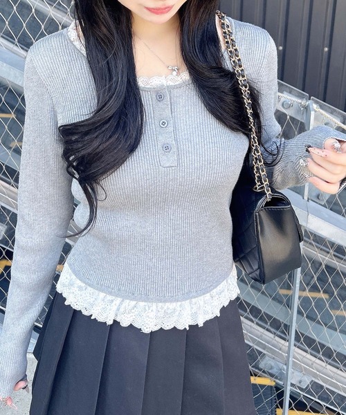 2025 AW 秋冬アイテム【人気のフリルレーストップスから長袖ニットタイプが登場♡】▼Design半袖も長袖も大人気のフリルレーストップスからついにニットタイプが登場しました!薄手のニットなのでアウターの下にも気にせず着ていただけます♪細リブでジャストサイズのつくりなのですっきりと着れるニットトップスです。胸元と裾にあしらわれたレースがトレンド感と可愛らしさを演出♡▼Stylingシンプルかつベーシックな形なのでプリーツスカパンやバルーンスカートと合わせるのがおすすめです♪レースがあしらわれているのでデニムと合わせてもシンプル過ぎないコーデに仕上がります。シンプルな形に薄手のニット素材なので上に羽織るアウターも選びません!▼Recommend・ヘンリーネック・フリルレース・リブニット・シンプル・普段使い※ご覧のモニター環境や撮影環境により実際の商品と多少色味が異なって見える場合がございます。ご理解の程よろしくお願いいたします。≪お買い物をよりお楽しみいただくために♪≫▼商品のお気に入り登録完売カラーの再入荷通知や、完売間近の通知、セールの通知を受けることができます。▼ブランドのお気に入り登録新商品や再入荷など、いち早くブランドのお得な情報を受け取ることができます。