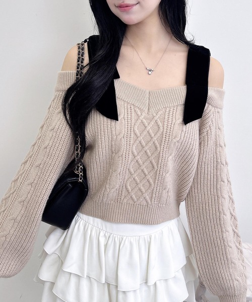【ベロアリボン×ケーブルオフショル!この冬イチ押しあざとニット♡】 ▼Design ゆったりとしたサイズ感のケーブル編みオフショルニット。 太めのショルダーストラップには INGNI定番の大きめリボンが施されていてかわいい♪ ベロアリボンなので高級感があり上品な印象に! リボンは縫い留めてあるので、ほどける心配もありません。 浅めのVネックが顔周りをスッキリと見せてくれます。 ルーズなケーブル編みのオフショルニットに肩のベロアリボンの組み合わせが この冬とっておきの着こなしを叶えてくれます。 デートや推し活にもおすすめです♡ ▼Styling シンプルなケーブル編み×ベロアリボンは上品なマーメイドスカートと相性抜群です♡ ミニボトムを合わせれば、ゆるニットのシルエットが引き立つバランスの良いスタイリングに。 落ち着いた色味なのでツイードやチェック柄と合わせることでより冬らしいガーリーコーデの完成♪ ・リボン取り外し不可 ・ニット製品のため生地に伸縮性があり、サイズに若干の誤差が生じる場合がございます。予めご了承くださいませ。 【以下ベージュ参考。カラーにより多少の誤差あり】 ・透け感:やや透ける ・伸縮性:あり ・生地の厚さ:普通 ・裏地:なし ▼Recommend ・2WAY ・ベロアリボン ・オフショル ・ケーブルニット ・肩リボン ・Vネック