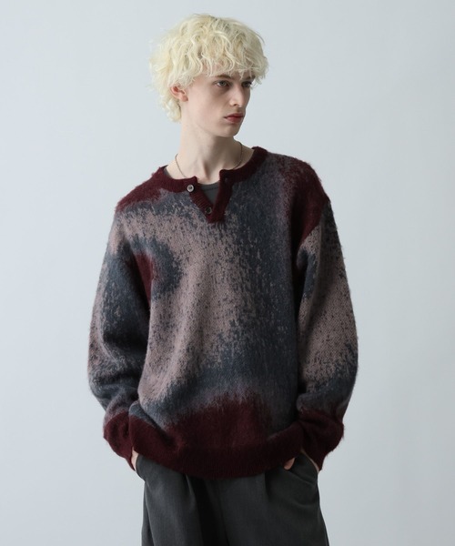 ーーー トレンド感のあるヘンリーネックとアーティスティックなグラデーション柄が目を惹くニット ーーー DESIGN 大胆かつ繊細なグラデーション柄が特徴。単色にはない奥行きと表情が、シンプルな冬のコーディネートに個性的で洗練されたアクセントを加えます。 首元はトレンド感のあるヘンリーネック仕様。ボタンがさりげないポイントとなり、クルーネックとは一味違うこなれ感を演出します。 オーバーサイズシルエットで、リラックス感のある着心地と体型を拾わない自然なドレープ感を実現。 ニット自体に存在感があるため、ボトムスはデニムやスラックスなど、シンプルなアイテムと合わせるだけでお洒落に決まります。 MATERIAL 軽量感がありチクチクしにくい柔らかな肌触りで、ストレスフリーな着心地。 少量のウールを混紡することで、天然素材ならではの優れた暖かさと、ふっくらとした質感を実現。