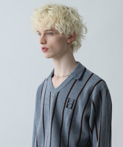 ーーーレトロな雰囲気とストリート感を融合させたゲームシャツーーーDESIGNスポーティなテイストのゲームシャツをニット素材で作成することで、モダンな雰囲気に仕上げています。縦のラインが強調されたストライプ柄が特徴。胸元にはブランドロゴのモチーフをあしらい、存在感と個性をプラス。シャツカラーとVネックの組み合わせが、襟元をすっきりと見せ、ネックレスやインナーの色を楽しめるデザインに。インナーには無地のハイネックやTシャツを合わせるのがおすすめ。ボトムスは、太めのスラックスやデニムと合わせることで、リラックスしたムードを保ちつつ、トレンド感のある着こなしが完成します。MATERIALポリエステルをベースとした素材のため、軽量感がありストレスフリーな着心地。レーヨンの混紡により、滑らかでしっとりとしたタッチ感があり、チクチク感が少なく快適に着用出来ます。