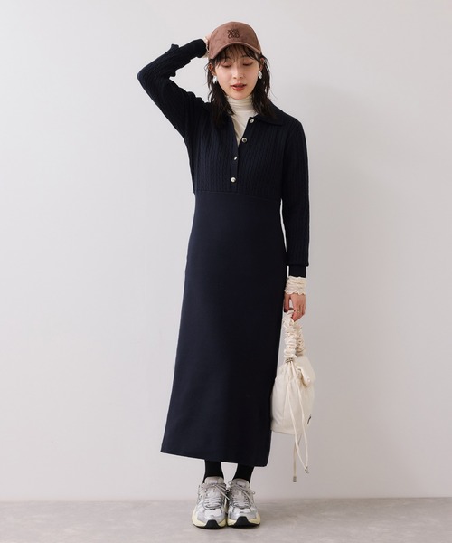 きちんと感と華やぎのいいとこ取り!冬のイベントに寄り添う万能ニットワンピ。【2025 Autumn/Winter】【25AW】<POINT>・ポロ襟できっちり感も演出した旬デザインは、ホリデーにも帰省にも着回せる万能さです。・きらっと上品なメタルボタンはアクセントに・トップス部分はケーブル柄、スカート部分はミラのリブ編みでウエスト切り替えのような美シルエット・もちもち素材で着心地も抜群。長時間の移動も快適な帰省スタイルを上品にまとめてくれる1枚。【デザイン・シルエット】ポロ襟ニットにナロースカートがついたワンピース。1枚で旬なスタイルになります。ウエストは程よくシェイプしすっきりとした美シルエットが楽しめます。伸びがよいので足さばきもよいです。スカート部分は少し厚めになっています。※スリットなしデザイン。【素材】モチモチ感が気持ちの良い肌触り。【カラー】エクリュに近いオフホワイト、グレイッシュなベージュ系、濃紺の3色展開。【おすすめのスタイリング】1枚でも旬の顔になります。ストールにアクセントカラーをもっていくスタイルもおすすめ。また、すっきりとしたシルエットなのでジャケットやコートとの相性もばっちりです。-----------------------------裏地:なし光沢感:なし透け感:ややあり伸縮性:ありポケット:なしボタン:あり(開閉可)生地の厚さ:やや厚手季節:秋、冬-----------------------------【モデル着用サイズ】身長:161cm 着用サイズ:F※画像の商品はサンプルです。実際の商品と仕様、加工、サイズが若干異なる場合がございます。※画像によっては実際の色味と異なる場合があります。正しい色味は生地アップ画像をご確認ください。