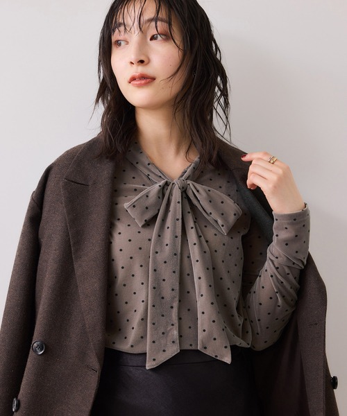 【2025 Autumn/Winter】【25AW】<POINT>・柔らかくベロアの表面感が可愛いカットソー・ボウタイ付きでインナー・トップス使い両方が叶います!・コンパクトながら伸縮性があり着心地も〇【デザイン・シルエット】程よく身体に沿うシルエット。ドット柄とフロントリボンデザインで秋冬に着回しのきくカットソーです。アウトスタイリングでも着用できるようサイドにゴムギャザーを寄せてすっきりとしたフォルムにしました。【素材】柔らかいタッチのベロアカットソー素材にドットプリントを施しています。【カラー】オフホワイト、ベージュ系の2色展開。※ドットのカラーオフホワイト(15):ブラックベージュ系(28):ダークブラウン【おすすめのスタイリング】カーデやジャケットの中にインするのにピッタリです!デニムに合わせたり、マーメイドスカートでレディなスタイリングにも相性〇-----------------------------裏地:なし光沢感:ややあり透け感:ややあり伸縮性:ありポケット:なしボタン:なし生地の厚さ:普通その他仕様:リボンは取り外し不可季節:秋、冬-----------------------------【モデル着用サイズ】モデル身長:161cm 着用サイズ:F※画像の商品はサンプルです。 実際の商品と仕様、加工、サイズが若干異なる場合がございます。※画像によっては実際の色味と異なる場合があります。正しい色味は生地アップ画像をご確認ください。