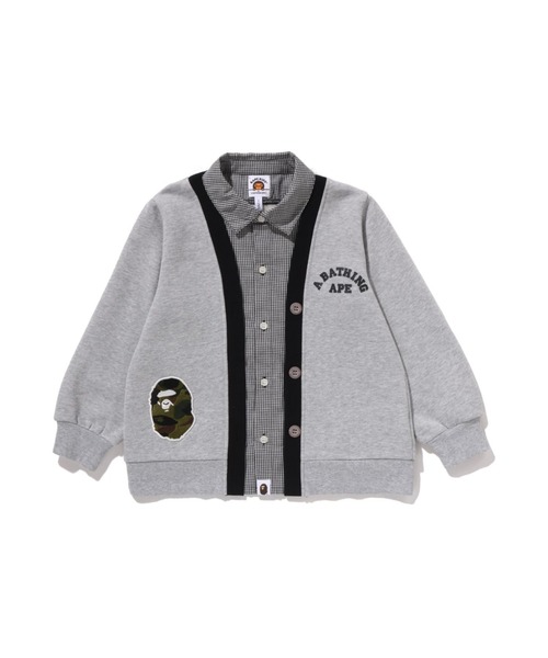 シャツとカーディガンのレイヤードアイテム。1ST CAMO柄のAPE HEAD ワッペンをあしらい、A BATHING APE ロゴをラバープリントしたデザイン。レギュラーフィットシルエット。
