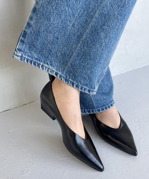 すっきりとしたフォルムにこだわったディープカットパンプス。ハーフウエッジヒールがモードな印象なので、コンサバにならずファッションアイテムとしてスタイリングしやすいパンプスです。シャープに見えつつも足を包み込むカッティングで履き心地にも配慮。程よいツヤ感と表情のあるスムースレザー調の素材で、さらっと合わせるだけで足元が決まる1足です。**********************【スタッフ着用コメント】《スタッフH》普段サイズ:23.5/着用サイズ:23.5サイズ感: 素足で着用して、普段のサイズでジャスト。履き心地:素足で履いて23.5でジャストサイズでした。窮屈感も特になく、薄手のタイツならこのままのサイズで履けそうです。横幅は割とゆったりなので甲高な私でも快適に履けました。***********************サイズによりヒールの高さが多少前後することが御座います。予めご了承ください。*照明の関係により、実際よりも色味が違って見える場合があります。またパソコン・スマートフォンなどの環境により、若干製品と画像のカラーが異なる場合もございます。*商品の色味は、商品アップ画像をご参照ください。