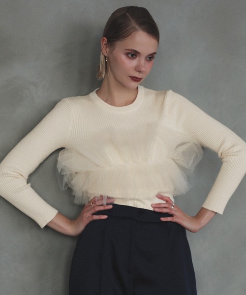 チュールリブトップスふんわりと軽やかなチュールと、体にほどよくフィットするリブ編み素材をコンビにしたトップス。都会的なフェミニンさを演出しながらも、日常のスタイルにさっと取り入れられる一枚です。柔らかなリブ素材で程よい伸縮性があり、着心地も◎一枚で存在感がありながら、ジャケットやカーディガンのインナーとしても活用でき、季節の変わり目にも重宝します。■point・柔らかなリブ編みのベースに、透け感のあるチュール素材をあしらうことで、軽やかなアクセントと女性らしいニュアンスをプラス。・リブ編みならではの伸縮性と程よいホールド感で、ボディラインを美しく見せつつもストレス少なく着用できます。・シンプルなボトムス(デニム、スラックス、タイトスカート)とはもちろん、フェミニンなスカートやジャケットとの相性も◎。■styling・ラフなデニムパンツ+スニーカーにこのトップスを合わせて、素材感でちょっとした“こなれ”を演出。・タイトスカートやテーラードジャケットと組み合わせて、トップスとしての存在感を活かしつつ、全体をすっきりとまとめたスタイルも。・足元にヒールを加えれば、簡単にお出かけ仕様にチェンジできます。【表記サイズ】FREEサイズ■FREEサイズ着丈約57cm肩幅約35cm袖丈約56cm袖口約9cmバスト約35cm裾幅約33cm伸縮性あり裏地なし透け感ホワイト若干あり【ご注意】 ■大変デリケートな素材を使用しているため、お取扱いには十分お気を付け下さい。 ■なるべく実物に近い色合いを再現しておりますが、お使いのモニターにより実際の商品カラーとは異なる場合がございます。 ■同商品・同色におきましても、染色やロットによって色合いや風合いなどが多少異なる場合がございます。 ■画像は参考画像です。写真と実際の商品の色・型が多少異なる場合がございますので、予めご了承下さい。 ■生産の過程上、寸法に多少の誤差(±2cm)が生じる場合がありますが、品質上・着用上に問題はございません。