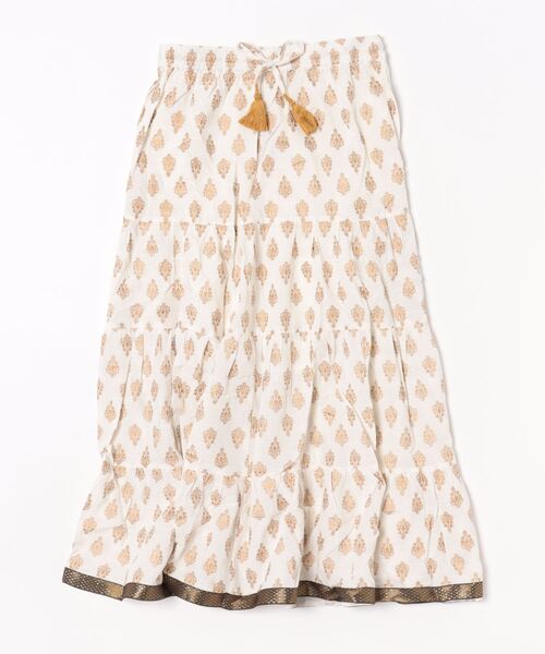 インドのローカルマーケットで売られている生地からインスパイア。フォークロアテイストなラメプリントのティアードロングスカート。高めにおいた切り替え位置で、フェミニンすぎないカジュアルな印象に。裾のゴージャスなテープ使いもポイントです。※こちらの商品は1点1点職人による手作りとなります。その為、形や色合いなど若干異なる場合がございます。あらかじめご了承ください。Amina Collection Co.,LTD.