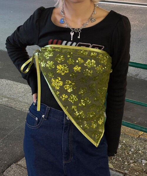 アレンジ自在なスパンコールスカーフ▼ポイントキラキラのスパンコールが目を惹く三角スカーフ。胸に巻いてトップス風に、腰に巻いてポイントアクセに、頭に巻いて三角巾としても使えるマルチアイテムです。コーデにひとつプラスするだけで、Y2Kムード漂う華やかな印象に仕上がります。▼スタイリングデニムやカーゴパンツに胸巻きスタイルで、肌見せが可愛いトレンドルックに。腰や頭に巻いて、Tシャツやキャミに抜け感をプラスするのもおすすめです。---------------------------------------------------透け感:あり伸縮性:なし裏地:なし光沢:あり---------------------------------------------------家庭洗濯:40℃限度/手洗い可タンブル乾燥:不可アイロン:不可クリーニング:ドライクリーニング不可、非常に弱い処理によるウェットクリーニング可この製品に使用しているスパンコール刺繍は、強い摩擦や衝撃を加えると取れる恐れがあり、縫い付けた糸が切れると修理、復元が困難ですので糸切れにご注意ください。・洗濯は軽く押し洗いをし、ドライクリーニングは避けてください。・着用の際、周囲のものを引っ掛けたりする恐れがありますので、デリケートな素材の衣服・小物等との組合わせにはお気をつけください。・バッグやベルト等で過度にこすられたりしますと、スパンコールが取れたり、破損する恐れがありますので、ご注意ください。・スパンコールの変形・変色の原因になりますので、直接アイロンを掛けたり、スチームを掛けることは絶対に避けてください・防虫剤の影響で、変色・変形することがありますので、保管の際は防虫剤が直接触れることのない様に保管してください。---------------------------------------------------【HELLO.SANFRANCISCO/ハローサンフランシスコ】西海岸を代表するサンフランシスコ。年中暖かく、穏やかでフレンドリーな都市。少し懐かしさを感じる柄やアイテムを今の女の子に向けて提案。メンズライクな素材を女の子が着るシルエットに落とし込んだアイテムなどトレンドに敏感でいろんな気分に合わせて、服を選ぶ女の子のためのシリーズ。---------------------------------------------------※着用、お取り扱いの際は、商品についている品質表示とアテンションタグを必ずご確認下さい。※画像の商品はサンプルです。実際の商品と仕様、加工、サイズが若干異なる場合がございます。※可能な限り実物に近いカラーにて掲載していますが、撮影環境やモニター環境などにより製品と画像のカラーがやや異なって見える場合もございます。予めご了承ください。【お買いものをよりお楽しみいただく為に!!】▼商品のお気に入り登録(ハートマークをクリック)お気に入りアイテムの完売カラーの再入荷通知や、ラスト1点の通知、セールの通知も受け取ることができます。▼ブランドのお気に入り登録新商品や再入荷、クーポン配布などのお得な情報を受け取ることができます。