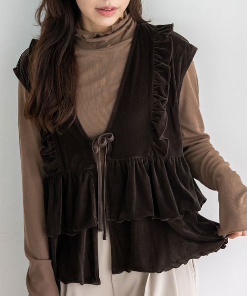 【デザイン】 ベロアフリルティアードベスト 上品な光沢感が魅力のベロアペプラムベスト。 華やかなフリルとティアードシルエットで、大人可愛いスタイルを叶えます。 動くたびにフリルがふんわり揺れ、女性らしさを引き立てる一枚です。 前開き仕様で、リボンを結んで着用するデザイン。 着脱しやすく、軽やかに羽織れるのも嬉しいポイントです。 深めのVネックでインナーを選ばず顔周りもスッキリ◎ タートルネックやカットソー、ワンピースとも好相性。 フリルとペプラムの切り替えデザインが、 腰まわりをふんわりカバーしながら華やかさをプラス。 落ち着いたカラーで合わせやすく、デイリー使いはもちろん、お出かけコーデにもおすすめです。 シンプルコーデにプラスするだけで、今っぽいレイヤードスタイルが完成。 トレンド感と着回し力を兼ね備えた、秋冬の主役級ベストです。 【サイズ等】 サイズ:FREE(M-Lサイズ相当) 総丈:55cm 肩幅:47cm 身幅:50cm 重量:180g 素材:ポリエステル95% ポリウレタン5% ※商品タグには「Mサイズ」と記載がございますが、こちらの商品はワンサイズ展開となっております。 実際のサイズ感は M~Lサイズ相当です。 …………………… 伸縮性:あり 裏地:なし 透け感:なし 生地の厚さ:普通 ポケット:なし …………………… 【お取り扱い上の御注意】 ・ネット使用。 ・タンプラー乾燥禁止。 ・アイロンの際はスチームで浮かせてください。 ・デリケートな素材を使用しているため縫い目やメロー仕上げ部分が滑脱する場合があります。 着用や洗濯の際はお取扱いにご注意ください。 ・糸、編地の性質上、洗濯や着用中の摩擦により生地表面にピリングが生じることがあります。 ・水や汗で色落ち、移染する恐れがありますので、濡れた状態で放置しないでください。 また、お洗濯の際は他のものと一緒に洗わないでください。 ・粗い組織のものや、ルーズな組織のものはちよっとした不注意から引っかけてしまいがちですので、取扱いの際は十分注意して下さい。 ・着用時にベルト、バッグ、周囲の壁など、表面に凹凸があるものとの引っかかりにご注意下さい。 ・洗濯の際は他のものとの引っかかりに注意して下さい。 ・ネックレス、指輪、時計等の装飾品は生地がほつれる原因になりますので着用後にお付けになることをおすすめします。 ・大変デリケートな素材を使用しておりますので激しい運動や強度な力が加わると、 縫い目が開いたり、目割れ(編み糸が滑って偏り、生地に隙間が空く)することがありますのでご注意ください。 ・長時間濡れたままで重ねて置いたり、摩擦(特に湿った状態での摩擦)や、汗や雨などでぬれたときは他の衣料等に移染する場合が ございますので、お気を付けください。また、洗濯の際には移染する場合がございますので、他の物とは分けて洗ってください。 ・洗うと多少縮みます。あらかじめご注意ください。 ・この商品は、摩擦(特に湿った状態での摩擦)や、汗や雨などで濡れた際にほかの衣粒や下着(特に淡色)に 色移りする場合がありますので充分にご注意ください。 [カラー] ブラック・グレージュ・アイボリー モデル身長:158cm/着用サイズ:FREE ※撮影環境により実際のカラーとやや異なる場合がございます。 画像をご参照の上、ご了承頂けますようお願い致します。 ◆商品のお気に入り登録◆ 完売カラーの再入荷通知や、ラスト1点の通知、 セールの通知も受け取ることができますので、是非ご登録ください。 ◆ブランドのお気に入り登録◆ 新商品や再入荷などの情報を受け取ることができますので、是非ご登録ください。