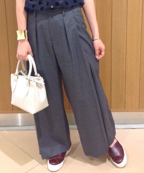【2015 AW】 JOURNAL STANDARD JOURNAL STANDARDのワイドパンツ。 さらりとした滑らかに落ち感のあるウールトロの素材感を使用。 前とサイド、バックは、玉縁の下からタックをいれ、立体的に仕上げることで美しいシルエットが出るようこだわりました。 シンプルなシャツやハイネックと合わせて、パンツを主役にしたスタイリングがオススメです。 引き続き注目のワイドパンツのバリエーションに加えておきたいアイテムです。 ※取り扱いについては、商品についている洗濯表示でご確認ください。 ※店頭及び屋外での撮影画像は、光の当たり具合で色味が違って見える場合があります。 商品の色味はスタジオ撮影の画像をご参照ください。