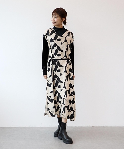 プリントノースリワンピース1枚で華やかに決まる、存在感のあるプリントノースリーブワンピース。軽やかな素材感と美しいシルエットが、季節の装いを上品に引き立てます。■デザインポイントシーズンムード漂うオリジナルプリントが印象的。程よくフィットするウエストラインと、裾に向かって広がるフレアシルエットで女性らしいバランスに。ノースリーブでも肩をやや覆うカッティングで、気になる部分をさりげなくカバー。■おすすめコーディネートカーディガンやジャケットを羽織って、通勤やお出かけスタイルに。足元はヒールで上品に、スニーカーでカジュアルダウンも◎。秋にはタートルや長袖Tシャツをインして、レイヤードスタイルもおすすめ。--------------------------------------透け感:なし裏地:なし伸縮性:なしケア方法:ドライクリーニング※お洗濯の際は洗濯表示を必ずご確認ください。--------------------------------------