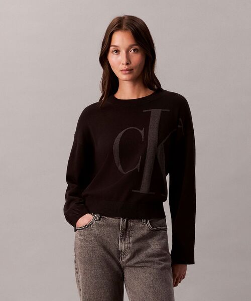 ニット - ロングスリーブスムースコットンセーターモダンなルックに導く、クロップド丈のクルーネックセーター。袖口と裾はリブで切り替えながらも、フィットさせることなくゆったりと仕上げています。前身頃は左半分に、大胆にモノグラムロゴをオン。アシンメトリーなデザインは、見る角度で表情を変えます。コットンのさらっとした風合いで快適な着心地です。====================【Calvin Klein Jeans(カルバン クライン ジーンズ)】 カルバン・クラインは、世界でも有数のデザイナーズ・ライフスタイル・ブランドのひとつであり、世界中で好まれるアイテムの数々を提供しています。カルバン・クラインのモダンでミニマルな美学はシーズンごとに新しく解釈され続け、力強いコミュニケーション力で世界的に大人気ブランドの地位を保ち続けています。そのブランドのひとつであるCalvin Klein Jeansは、官能的で挑発的、若々しさを具現化したデザイナーズジーンズブランドの元祖になります。