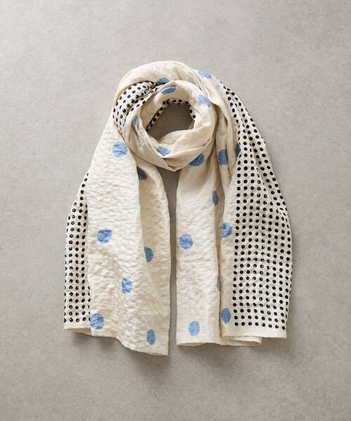 ■アイテム大きさの異なるドットをプリントしたストール。縦のラインに入った刺繍ステッチがポイント。≫《CITRUS》アイテム一覧《CITRUS / シトラス 》2005年にMadhu KillaとVinay Killaによって誕生した、インドのスカーフブランド。高品質なファブリックを使ったスカーフ、ショール、ブローチ、ファッションジュエリー、コサージュといったアイテムを展開。インドの伝統的なテクニックを使った、職人のハンドクラフトです。■素材素材:綿50% シルク50%洗濯表示:ドライクリーニング※着用時・洗濯時は、必ず取扱い表示・タグをご確認の上、お取り扱い下さい。----------------------------------伸縮性:なし光沢:あり厚み:薄い透け感:なし裏地:なし----------------------------------▼ブログでご紹介《商品について》※こちらの商品は店頭陳列商品も含まれる為、ブランドロゴ用紙破れ、商品タグなどが無い状態、陳列によるしわ等が生じる場合がございますが商品に影響はございません。また国内製品と比べますと、若干のシミ、汚れ、ほつれ、糸の始末など、多少つくりが甘い部分がございます。ご了承ください。・サンプルの為、素材情報については企画段階の情報を記載しております。公的機関での試験データ結果を受け、量産にあたり混率の変更が発生する場合がございますので、ご了承くださいませ。・サンプルでの撮影、計測をしております。商品の仕様が一部変更になる場合がございます。・撮影サンプル品はブランドタグがついておりません。製品にはタグがつきますので、製品の表に縫い糸が見える場合がございます。・工場の生産の都合上、納期が変更になる場合がございます。検品や輸送の関係で、発送日が前後しますのでご了承ください。また、入荷状況により、お客様への発送が店頭販売より遅れる場合もございます。・店頭に陳列していた商品も含まれる場合がございます。《商品画像について》ご覧頂いている商品の写真につきましては、できるだけ実物の色に近くなるように努めておりますが お使いの環境(モニター、ブラウザ等)の違いにより、色の見え方が実物と若干異なる場合がございます。 予めご了承ください。《ハートをタップして商品のお気に入り登録》登録カラーの商品の「残りわずか」「再入荷」「値下げ」通知を受け取ることができます。各ショップアプリにてブランドフォロー 新商品などの入荷情報、最新のニュースやお得な情報を受け取ることができます。