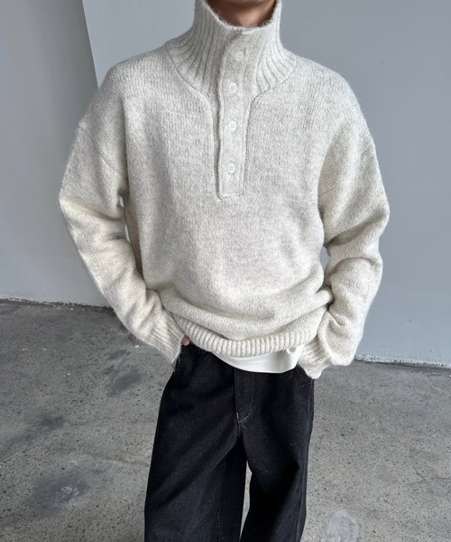 気分に合わせて着こなし自由自在! 抜け感を楽しむ、大人カジュアルなプルオーバーニット 【デザイン】 ■ 1枚でこなれ感を引き立てる、最旬ニット ボタンを留めればスタンドネックにもなる、着こなし自在なデザインニット。ゆるめのシルエットがストリート感を演出しつつ、程よく上品な風合いで大人の抜け感もプラス。シンプルながらも1枚で存在感のあるルックスで、今季の主役トップスとして活躍します。 ■ 旬のビッグシルエット 肩幅、身幅に余裕を持たせたオーバーサイズでヌケ感を楽しめるサイジング。 ゆったりとした絶妙なルーズさで、着こなすだけでトレンド感のあるコーデに。 着こなしスタイリングに新鮮味をプラスしてくれること必至です! ■ ユニセックスアイテム カジュアル、ストリート、きれいめ、韓国系など、スタイルを問わない万能アイテム。 メンズ・レディースを問わない男女兼用の対応商品で、プレゼントにもオススメ。 ペアやカップルコーデのお揃いにも最適で、家族でシェアしたりと幅広く活躍します。 【ファブリック】 ■ ウールのチクチク感が無い肌触りの良い生地 程よい膨らみと肌触りの良い素材感。チクチク感が苦手な方でもオススメです。 ゆったりめのサイジングを取り入れ、サラッとした程よい生地感で着心地も抜群です。 【コーディネート】 カーゴパンツやワイドデニムなど太めのボトムスと合わせたスケータースタイルや、トレンドのフレアパンツやスラックスなどと組み合わせた現代風なモードスタイルにも◎ ニットキャップやバケットハットを合わせると、更に旬なスタイリングでまとまります。 男女共にユニセックスで着用できるので、女性のストリートスタイルにも最適! アイテム次第で様々なコーディネートを楽しめ、韓国ストリート、古着mix、カジュアルと様々なスタイリングと相性◎ ※こちらの商品の画像はサンプルを使用しているため、実際の商品と仕様、加工、サイズ、素材が若干異なる場合がございます。 また、画像の商品は光の照射や角度により、実物と色味が異なる場合がございます。予めご了承くださいませ。 【お買い物をよりお楽しみいただくために】 ▼商品のお気に入り登録(ハートマークをクリック) 完売カラーの再入荷通知や、ラスト1点の通知、セールの通知も受けることができます。 ▼ブランドのお気に入り登録 新商品や再入荷など、いち早くブランドのお得な情報を受け取ることができます。
