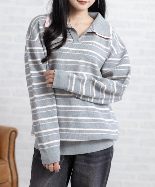きれいめカジュアルの主役級ニット!レイヤード襟付きボーダーニットトップス【デザイン】1枚でスタイリングが決まる、レイヤード襟付きニット。やわらかな風合いのニット素材に、細ピッチのボーダーを施し、ラフすぎず上品な印象に仕上げました。襟部分はレイヤードのデザインで、重ね着風の抜け感を演出。ゆったりとしたシルエットで体のラインを拾わず、リラクシーな着心地です。【素材感】伸縮性のあるレーヨン素材伸縮性:若干あり/ 透け感:なし/ 裏地:なし 水洗いによる洗濯不可 / ドライクリーニング可【コーディネート】プリーツスカートにブーツやパンプスを合わせて、フェミニンMIXコーデに。カーゴパンツやスウェットパンツでゆるっとカジュアルコーデおすすめ◎デニムミニスカートにロングブーツを合わせて王道ガーリーカジュアルコーデにしても可愛いです♪【※お取り扱い上のご注意】1:モニター環境等により実際の商品と多少色味が異なって表示される場合がございます。予めご了承下さい。2:屋外で撮影された商品は、天候により多少実際のカラーと異なる場合があります。商品のカラーはトルソー(マネキン)の商品画像をご参照ください。3:濃い色の商品は、お洗濯や摩擦等による移染にご注意ください。4:末永くご愛用頂く為に、アテンションタグ・洗濯ネームを必ずご確認の上、着用又はお取り扱い下さい。5:生産時期により、色、サイズ、デザイン、素材の質感が多少が異なる場合がございます。あらかじめ御了承下さいませ。