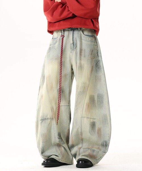 独特のウォッシュ加工とアートのような色ムラが目を惹くバルーンシルエットのデニムカーブパンツ。 立体的なカッティングラインが生み出すワイドなフォルムは、ボリューム感がありラフな着心地の一枚。 ウエストは程よくフィットし、裾に向かってカーブシルエットに立体感をプラス。 ヴィンテージ感のあるブリーチトーンに、ランダムなペイント風の色落ちを施し、存在感抜群の一本に仕上げています。 バックポケットには控えめな刺繍ロゴを配置し、リアルな加工感の中にストリートエッセンスをプラス。 ゆるいシルエットと加工感でシンプルなトップスでも合わせるだけでお洒落な着こなしに。 男女兼用のユニセックスタイプで、ストリートからモードまで幅広く対応します。 ボリュームのあるトップスやオーバーシャツと合わせてカジュアルなストリートスタイルに。 クロップドスウェットやショート丈ジャケットと合わせて、シルエットのメリハリを出しても◎ ブーツや厚底スニーカーを合わせると、シルエットのボリューム感がさらに際立ちます。 公式instagram>>@hook_tokyo 新商品の紹介や、再入荷の情報などは更新中! 【お買いものをお楽しみいただく為に】 ▼商品のお気に入り登録 完売カラーの再入荷通知や、ラスト1点の通知、セールの通知も受け取ることができます。 ▼ブランドのお気に入り登録 新商品や再入荷など、いち早くブランドのお得な情報を受け取ることができます~