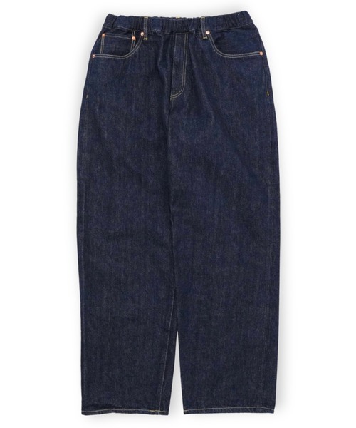 YOKO SAKAMOTO ユニセックスブランドとして展開。 ブランドコンセプトはシーズン毎に敢えて設けず、「日常着」として常に身につけたくなるプロダクトを提案。また、女性デザイナーが作り出すメンズウェアという独自の空気感にもこだわったモノづくりを行っている。 ------------------------------------------------------ 岡山県の歴史のある機屋にて、旧式の力織機(シャトル織機)で、ゆっくりと丁寧に織り上げた、独自の風合いが特徴のセルビッチデニム。 製織後、水洗いや防縮加工を含めた仕上げ加工が一切施されていない生機デニムを使用しております。 旧式織機を用いる為、生産効率は非常に低く、1時間にわずか数メートルしか織る事が出来ません。 しかし、この丁寧な製法により、経糸に無理な張力を掛ける事無く、シャリ感と膨らみを併せ持つ、他には無い風合いの生地に仕上がりました。 厳選した綿花を使用し、繊維の質感や長さを吟味。 さらに、シャリ感のある手触りを実現する為、撚り回数や形状にも細部まで拘っています。 一周ウエストゴムが入ったリラックスフィットの 5ポケットイージーパンツ。 一見シンプルな 5ポケットパンツのデザインですが、ウエストにゴムを入れたイージーパンツ仕様。 リラックス感のあるワイドなストレートシルエットが特徴。 リベットは鉄製の銅メッキ。 徐々に錆びて行く為、独特な風合いとルックスに育ちます。