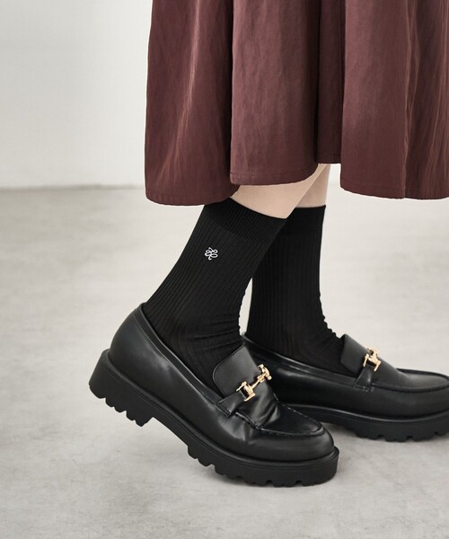 使い勝手の良いリブソックス【素材感】 ・光沢があり、さらっとした生地感。 【デザイン・シルエット】 ・シンブルなロゴ刺繍入りのリブソックス。 ・さらっとした肌触りのソックスはシーズン問わずデイリーに活躍してくれる。 【カラー】 ・ブラック、ホワイト、ブラウン、シルバーの豊富な4色展開。 【スタイリングポイント】 ・ローファーと合わせたり、ミュールと合わせるのもおすすめ。 ・デニムやチノパンの裾からさりげなく覗かせると◎。 ※撮影時の光、お使いのモニター環境によって色の見え方が違う場合がございます。