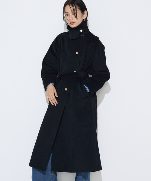 《デザイン》クラシックなトレンチコートのディテールを取り入れた、スタイリッシュなロングトレンチコートです。メタル釦をアクセントにした、他にはない一着です。トレンチディテールでトラディショナルな雰囲気を表現しています。肩回りが動きやすく、ゆとりを持たせるラグランスリーブです。後身頃のケープ状についたアンゴラヨークです。2WAYにできる襟タブで、上まで釦を閉め襟タブをすればスタンドカラ―コートとして着られます。(取り外し可能で、左身頃の内側裾付近にある釦二個に留めて収納できる仕様です)後身頃のロングベンツを留められる釦仕様です。ベルト裏は合皮できりっと引き締めます。旬を感じさせる超ロング丈がモードです。K.Tオリジナルのメタル釦です。ホーニング+パール薄ゴールドのオリジナル別注メッキです。パール薄ゴールドというオリジナルメッキカラーで、ゴールドよりも上品なカラーです。仕上げに光沢マットのホーニング加工をしています。ヘイズブルーのみ同色染のポリエステル釦を使用し、やわらかさをキープします。襟タブまで留め、ウエストベルトでマークした着こなしがおすすめです。《素材》K.Tコート定番素材であるアンゴラウールショートフリース仕上げです。コート原料としては最高級素材”アンゴラ”をよこ糸100%に織り上げた超上質素材です。ふんわりした柔らかさと光沢、保温性に優れています。高級起毛(ショートフリース)仕上げで、毛足を揃え毛羽の乱れがありません。柔らかさドレープ性、ふくらみを活かし上品な光沢、肌触りが長く続きます。特殊加工を施し生地を表面にビロードのような美しい光沢のある表情をプラスしています。〈今年らしい旬のカラー展開〉22ヘイズブルー:くすんだ様なブルーがモードなニュアンスカラー14トープ:KT定番の上品なニュアンスカラー05ブラック:素材の良さを際立たせる上品カラー