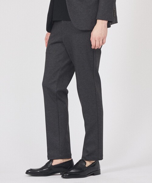 上質素材で格上げしたポンチスラックス【素材】ポリエステル・レーヨン・ポリウレタン混紡のプレミアムポンチ素材を使用。布帛のような構築的な表情としなやかな光沢、程よいストレッチを併せ持ち、シワになりにくくケア性も良好です。着用時のドレープとフィット感で上質さを実感できます。【デザイン】ウール調バーズアイ(チャコールグレー/ネイビー)とウインドペン(ブラウン)をプリントで表現したスタイリッシュなテーパードスラックスです。過度な装飾を排し、素材の伸縮性を活かしたパターンで美しい脚長シルエットを実現。ウエストは伸縮性の高いゴム仕様で、イージーな着脱感と優れたフィット感を両立します。【コーディネート】同素材ジャケットとのセットアップで統一感ある格上げスタイルがおすすめです。シャツやローファーでフォーマルに、ニットやスニーカーで休日のカジュアルダウンにも対応します。同素材ジャケット品番:71519382001**********************透け感:なし裏地:なし伸縮性:あり光沢感:なし生地の厚さ:普通クリーニング方法:手洗い可**********************