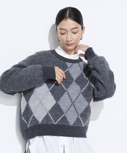 《デザイン》昨年ご好評いただいたブロックチェック柄セーター(商品番号:72-34II15-205)ですが、今年はアーガイル柄として登場します。三色の糸を使用してアーガイル柄を表現するために何度も試作を重ねてでき上がっているので、ギャバジンKTオリジナルのアーガイル柄に仕上がっています。シルエットはベーシックな雰囲気を残しつつ、身幅にゆとりを持たせてカットソー感覚で着られます。一枚で着てもサマになりますが、シャツなどのレイヤードして着るとおしゃれ度がアップし、暗くなりがちな冬のコーディネートを映えさせてくれます。《素材》18Gジャカード機という非常に特殊な機械で柄を編んでいます。とても細い糸で薄い編地をつくっており、強縮加工というお湯で洗いをかけてぎゅっと縮ませてあげることで、程よい厚みになり肌触りもふんわりと柔らかく仕上がります。