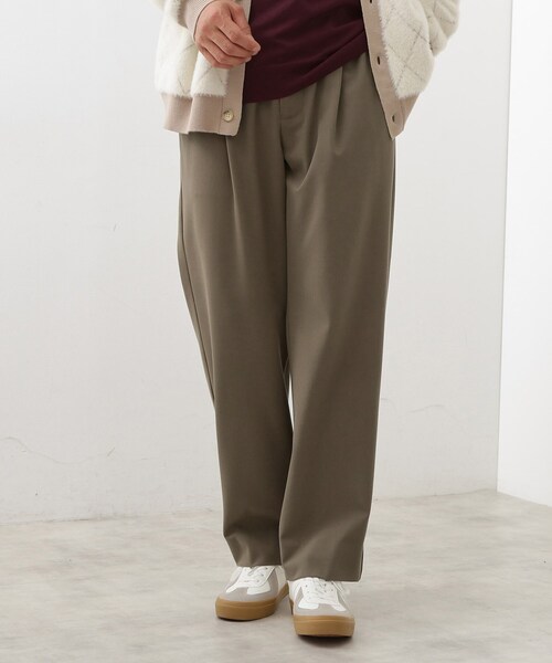 ■ポイント/詳細 ブランドが自信を持って提案する新シルエットのセミワイドイージーパンツ。 ワイドすぎない絶妙なシルエットが、きれいめで上品な印象を与えます。 無地と柄の展開があり、シンプルなコーディネートからアクセントを効かせたスタイルまで幅広く対応可能。 リラックス感と洗練されたデザインを兼ね備えた、大人のためのワイドパンツです。 さらに今季は裏起毛仕様のウォームバージョンが登場。 程よい厚みとふんわりとした起毛感が、寒い季節にも快適なぬくもりをキープします。 スタイルアップと防寒性を両立した、秋冬シーズンに頼れる1本です。 ■素材/機能特性 軽量で柔らかな肌触りのポリエステル混素材を使用し、快適な着心地を実現。 適度なストレッチ性があり動きやすさも◎。 さらに、シワになりにくい特性があるため、お手入れが簡単でデイリー使いに最適です。 ウォームバージョンでは、裏起毛加工により保温性をプラス。 肌あたりがやさしく、穿いた瞬間からあたたかさを感じられる仕上がりに。 上品な質感はそのままに、カジュアルからきれいめまで幅広いシーンで活躍します。 ■おすすめコーディネート ・無地タイプは、シャツやジャケットと合わせて、きれいめなオフィスカジュアルスタイルに。 ・柄タイプは、無地のTシャツやニットと組み合わせて、程よく遊び心のある休日コーデにおすすめ。 ・スニーカーやローファーを合わせて足元でカジュアル感や上品さを調整するのも◎。 ・ウォームタイプは、コートやダウンベストと合わせた冬の大人カジュアルスタイルにもマッチします。 【仕様】 ・ポケット数:横×2 後ろ×2 ・前ファスナー ・ウエスト総ゴム ・裏地なし(裏起毛タイプは内側起毛仕様) ※照明の関係により、実際よりも色味が違って見える場合があります。また、パソコン・スマートフォンなどの環境により、若干製品と画像のカラーが異なる場合もございます。 モデル情報:身長180cm B90 W75 H92 着用サイズ:03(L) 店舗へのお問い合わせ商品番号:616-74022 ●製品寸法: 02(M):W94cm H110cm 股下72cm 前股上29cm 渡り幅36cm 03(L):W98cm H114cm 股下73cm 前股上30cm 渡り幅37cm 04(LL):W102cm H118cm 股下75cm 前股上30cm 渡り幅38cm 備考: