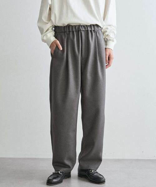 *上質見えのテーパードで作る、大人の冬定番 「ウール見えで扱いやすい素材感」 ポリエステル100%のツイル生地で、ウールのようなマットな表情と温かみを再現。 軽量で扱いやすく、デイリーに頼れる素材感。伸縮性もあり動きやすく、暖かいシーズンの着こなしにもフィットします。 「ゆとりとシャープさ両立するシルエット」 腰回りにゆとりを持たせたタック設計と裾に向かって細くなるテーパードラインで、楽に穿けて脚をすっきり見せるバランスに仕立てました。 ウエストゴム仕様でフィット感が良く、ベルトレスでも着用可能。 「オン・オフ問わない汎用性の高さ」 ロンTやスウェットを合わせてスニーカーで外し、抜け感のある休日スタイルに。 きちんと感が欲しい日は、シャツをインしてベルトやローファーで整えればオフィスにも対応。 さらに同素材のジャケットと合わせればワントーンのセットアップ風コーデが完成。 シーンを問わず活躍する万能な一着。 透け感[なし] 生地の厚さ[普通] 光沢感[なし] 伸縮性[ややあり] 裏地[なし] ポケット[あり] ※モデル着用画像は、光の当たり具合で色味が違って見える場合がございます。 ※お使いのモニター環境によって商品の色味が違って見える場合がございます。  ̄ ̄ ̄ ̄ ̄ ̄ ̄ ̄ ̄ ̄ ̄ ̄ ̄ ̄ ̄ ̄ ̄ ̄ ̄ ▼商品のお気に入り登録がおすすめです ▼ 商品ページ内のハートマークをクリック。完売時の再入荷や、最後の1点の通知、最後の1点など、お得なお値下げ情報を受けとる事ができます。 【お知らせ】ページでも通知が確認できます。  ̄ ̄ ̄ ̄ ̄ ̄ ̄ ̄ ̄ ̄ ̄ ̄ ̄ ̄ ̄ ̄ ̄ ̄ ̄