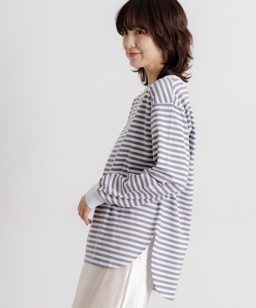 幅広い着こなしに使える万能アイテム一枚着としてもインナーとしても着用可能なロングスリーブTシャツーーー【素材】綿100%の天竺にシリコン加工を施した素材を使用。コシのある綺麗な仕上がりが特徴です。また、襟とお袖には編み柄を入れた編み出しのリブを使用しています。【スタイリング】一枚着としてもインナーとしても着用できるサイズ感のカットソー。綺麗めな素材を使用しているので、シルエットはすっきりとした大人の雰囲気に仕上げています。ラウンドヘムシルエットはカジュアルなコーデとも相性◎シンプルながらも細かいこだわりが詰まった一枚です。トップス カットソー ボーダー ロンTーーー【スタイリング】ラウンドヘムをポイントに、ニットやスウェットを重ねたカジュアルなレイヤードスタイグがおすすめ。カーディガンやベストのインにも◎