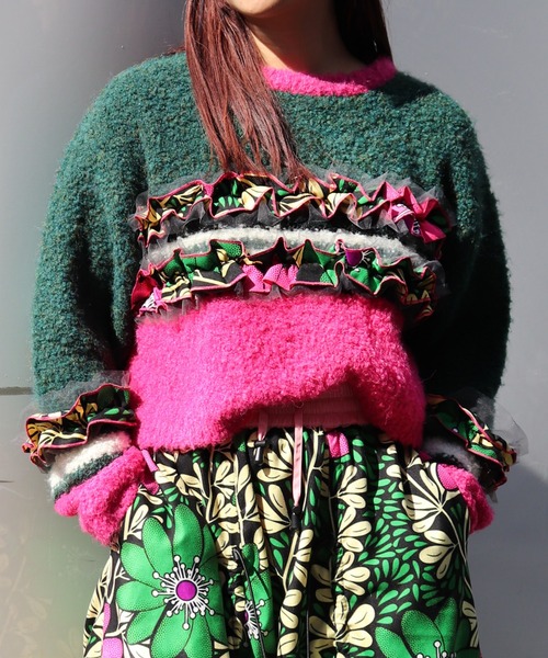 ブークレニットに柄とチュールを重ねたフリルを施したニットプルオーバー。サイズはMとLの2サイズ展開で着丈に大きく差をつけているので好みのスタイリングに合わせて選んで頂けます。ブークレニットはぽこぽことしたふんわりと柔らかく、軽く、着心地が良いので、重たいニットが苦手な方でもとっても着やすいニットです。発色の良いビビットなカラーを混ぜたマルチボーダーに、フロントと袖にはカラフルなナイジェリアの生地とチュールを重ねたフリルを装飾しているので、他にはない華やかで可愛らしいニットプルオーバーです。混率本体:ウール12% アクリル28% ポリエステル56%(うち、リサイクルポリエステル33%)スパン4%柄フリル:ポリエステル100%(アフリカ生地)チュールフリル:ナイロン100%サイズMサイズ:着丈45cm肩幅51.5cmバスト103cm袖丈50cmLサイズ:着丈56cm肩幅54.5cmバスト109cm袖丈51cm着用スタッフ★モデルA 172cm17154/MULTI1(RED×PINK系)×PAON Mサイズ着用29155/MULTI3(NAVY×YELLOW系)×CREAM DREAM Lサイズ着用45145/MULTI2(GREEN×PINK系)×VINE Mサイズ着用★モデルB 164cm45145/MULTI2(GREEN×PINK系)×VINE 164cm Mサイズ着用■ATTENTION・押し洗いをしてください。・蛍光増白剤配合洗剤は使用しないでください。・直射日光の当たらない、風通しの良い場所で保管してください。・濡れたままの放置や、長時間の浸漬はしないでください。・スチームアイロンを浮かしながらあてて下さい。・水洗い後の乾燥機のご使用は避け、自然乾燥してください。・染料の性質上、着用時に汗や摩擦により色落ちすることがありますのでご注意ください。・洗濯の際 色移りすることがありますので、他の製品と分けて洗濯してください。・他のものとの引っかかりにご注意下さい。・この製品は素材の性質上、表面の毛羽が絡み合いピリング(毛玉)が発生する恐れがあります。ピリングが出来てしまったら引っ張ろうとせず、 小さなハサミで丁寧に取り除いて下さい。・着用や洗濯を繰り返す事で、表面が擦れて毛羽立つ恐れがありますので、強い摩擦はお避け下さい。moyan ecri(モヤン エクリ)“どこかに模様を”をコンセプトに時代背景にあった模様や、その時感じた想いの模様を、シーズン毎にオリジナルのプリント、ジャカード、刺繍などで表現します。moyan AFRICAはFREEDOM×TREND×PEACEをコンセプトにアフリカのナイジェリアのカラフルなプリントのアフリカ布を使用したアイテムを展開します。アフリカ布の模様にはそれぞれ日本の和柄のように1模様ずつ意味のある唯一無二なFABRICです。-------------------【お買い物をより楽しみいただくために】▼商品のお気に入り登録再入荷、残り1点の通知を受け取ることができます。♡をクリックください。▼ショップ&ブランドのお気に入り登録新商品や再入荷、ショップのおすすめトピックスなど、いち早くブランドの情報を受け取ることができます。
