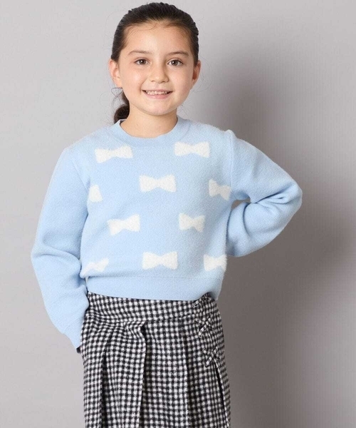 ◆リボン柄で可愛く♪トレンドのデザインのジャガードニット◆【デザイン】・リボン柄の部分がフサフサのフェザーヤーンになっている ・やや短めのクロップド丈でウエストすっきり、スタイルアップ◎ ・程よい厚みでトレーナー感覚で着られる。 ・もっちりした風合いで着心地◎ ・通学服もこだわりたいおしゃれキッズにおすすめ。【素材】・適度に厚みがあるジャガードニット素材。【スタイリング】・一枚で着映えるデザインで、通学・通園やお出かけに幅広く活躍! ・コーデの主役になるニットだから、ボトムはシンプルにまとめるのがおすすめ◎ ・スカートと合わせれば可愛いガーリーコーデが完成! ・一枚で着映えるデザインで、通学・通園からお出かけにと、幅広く活躍! ・シンプルなボトムやデニムワイド等を合わせたカジュアルなコーデも◎【カラー】・ライトブルー…女の子人気の高いおしゃれなライトブルー ・ブラウン…季節感のぬくもりカラー、ブラウン ・ライトグレー…ちょぴり大人なライトグレー----------------透け感:なし裏地:なし伸縮性:あり光沢感:なし生地の厚さ:普通----------------≪お気に入り登録機能の使い方≫■商品のお気に入り登録(ハートマークをクリック)再入荷通知や値下げ等、お得なご案内を受けることができます。 ※WEB・一部店舗限定販売です。----------------※サンプルでの撮影となるため、実際にお届けする商品と仕様やサイズが異なる場合がございます。※商品画像は、光の当たり具合やパソコンなどの閲覧環境により実際の色味と異なって見える場合がございます。 商品の色味の目安は商品単体の画像をご参照ください。