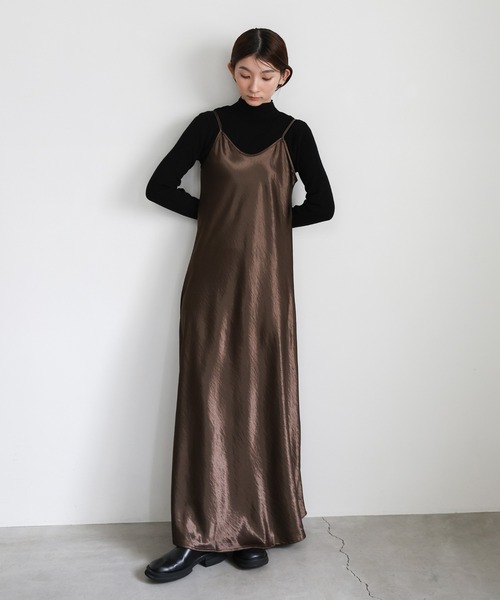 -point- & -styling- 艶と落ち感が上品なサテンワンピース。 無駄のないシンプルなデザインながらも素材の存在感でスタイリングを格上げしてくれる1枚。 しなやかな生地感が体のラインを美しく見せ、女性らしい印象を引き立ててくれます。 秋冬は温かみのあるニットと合わせて奥行きのあるレイヤードスタイル、 春夏にはシアーやカップ付きキャミソールと合わせたヘルシースタイルなど インナー次第でシーズン問わず長く楽しめます。 デイリー使いだけでなく、パーティーシーンやオケージョンシーンにも活躍するアイテムです。 コットン混レイヤードロングワンピース ---------------------------- 素材 ポリエステル54%・綿42%・ポリウレタン4% ---------------------------- 伸縮性 なし 生地の厚さ ★★☆☆☆ 裏地 なし ---------------------------- ※モニター・環境等により実際の商品と多少色味が異なって表示される場合がございます。 予めご了承をお願いいたします。 ======================= ■袋梱包の為、染料による特有の匂いが抜けきれず、匂いがする場合がございますが不良品にはあたりません。 上記注意点での返品、交換はお断りします。ご了承の上お買い求めくださいませ。 ■本製品は生産過程におきまして色味、サイズ感等若干の誤差が出る場合がございます。予めご了承くださいませ。 ======================= 【お買いものをお楽しみいただく為に!】 ▼商品のお気に入り登録 完売カラーの再入荷通知や、ラスト1点の通知、セールの通知も受け取ることができます。 ▼ブランドのお気に入り登録 新商品や再入荷など、いち早くブランドのお得な情報を受け取ることができます!