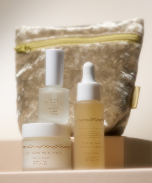 手肌をいたわり、指先に輝きを多くのお客様にご愛用いただいているハンドケアアイテム「リトリート ハンド シリーズ」とネイルオイルを組み合わせたスペシャルなセット 多くの方に愛されてきた「リトリート ハンド シリーズ」のセラムとクリームに、このセットでしか手に入らない、指先にツヤを与える「ネイルオイル」と、なめらかなベロア素材のポーチをプラス。 特別感のあるホリデーコフレ限定のセットをご用意いたしました。 乾燥しがちな季節に、手肌や指先をやさしくケアするひとときをお楽しみください。 セット内容 ・オサジ リトリート ハンド マッサージ セラム 30mL【現品サイズ・限定デザイン】 荒れがちな手肌をいたわり、デイリーに集中ケアができるハンド美容液。 丁寧なハンドケアで、ふっくらとみずみずしい手肌に。 ・オサジ リトリート ハンド モイスト クリーム 50g【現品サイズ・限定デザイン】 極薄ベールでしっかりとうるおいをキープする、濃厚高保湿モイストクリーム。 何度も触りたくなるようななめらかな手元へ。 ・オサジ リトリート ネイル スムース オイル 9mL【セット限定品】 3 種の植物油*で保湿力がありながらも、さらりとした心地のよいテクスチャでゆっくり丁寧にマッサージしながら、美しくつややかな指先に整えるネイルオイル。 *ホホバ種子油、スクワラン、コメヌカ油(全て保湿成分) ・オリジナル ベロア ポーチ 手肌にやさしく寄り添うような、なめらかなベロア素材のポーチ。 落ち着いた色味とふんわりした質感が、ホリデー気分を盛り上げます。 (サイズ:約H14.5×W15.5×D7.7cm 素材:ポリエステル、ナイロン、亜鉛合金) 香りについて アオモジ、ラベンダー、ゼラニウムの心地よくやさしい香り ※天然由来原料を使用しているため、製品単位によって色や香りが異なる場合があります。 使用方法 <リトリートハンドマッサージセラム> おやすみ前にスポイトで適量を手に取り、やさしく指先までマッサージしながら伸ばし、なじませます。リトリートハンドモイストクリームを重ねて使うと、うるおいを閉じ込める効果が増し、より一層しなやかな手元に仕上がります。 <リトリート ハンド モイスト クリーム> ハンドマッサージセラムでマッサージした後、適量を指先にとり、手全体にのばしてなじませます。 <リトリートネイルスムースオイル> キャップの刷毛で適量を取り爪やその周辺の肌に塗布します。爪の表面から甘皮や指の横にかけて、軽く押しながらゆっくり丁寧にマッサージするようになじませます。ネイル塗布前に使用する際は、油分を拭き取ってからのご使用をおすすめいたします。 リトリート ハンド シリーズとは 日々がんばる手元のために「静寂」と「慈しみ」をテーマに、シルクのようにやさしく包み込むハンドケアシリーズです。 ぬくもりと巡りを味方に、明日への一歩を踏み出すためのひととき。忙しい日々を支える手に、触れるたびやすらぎを感じられるリトリート時間を。 ※こちらのボックスのままお渡しいただけるような特別な仕様となっているため、さらなるギフトラッピングはお受けしておりません。