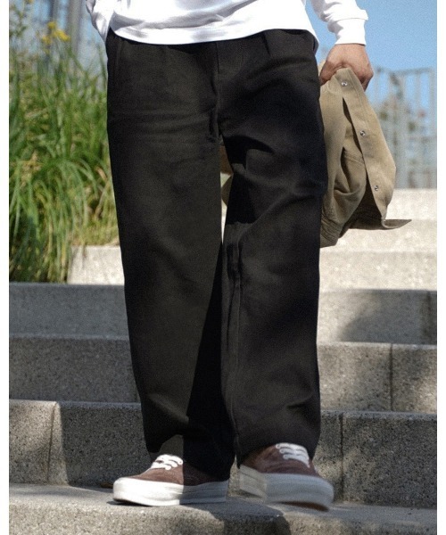 ■デザインポイント・シルエット ・太めのワイドシルエットで、リラックス感と旬なボリューム感を両立。 ・フロントにツータックを施し、腰回りに立体感と上品なシルエットをプラス。 ・裾はストレートカットで、ロールアップしてのスタイリングもおすすめ。 ・サイドポケット付きでデイリーユースにも便利。 ・バックポケットはブランドオリジナルピスネームが、さりげないアクセントに。 ■素材・生地感 ・厚手のチノ素材を使用し、程よい張りと重厚感で秋冬に最適な1本。 ・ハリがあるのでシルエットが美しく出る一方で、柔らかさもあり快適な穿き心地。 ・カジュアルにもきれいめにも合わせやすく、長く着用できる素材感。
