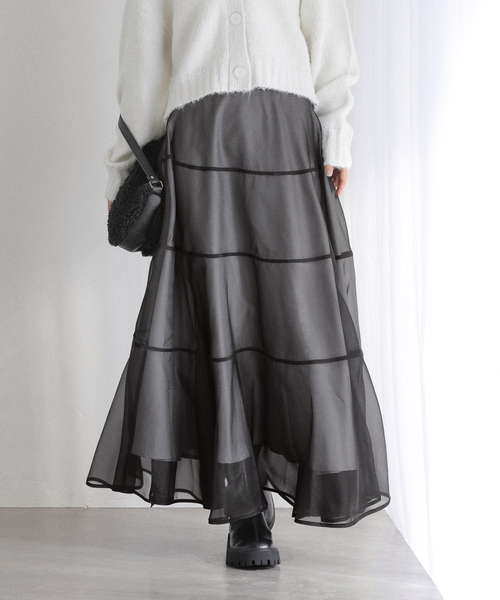 【2025AW】 La Totalite 軽やかなシアー素材が魅力のロングスカート。 パイピングデザインがアクセントになり、動くたびに表情のある華やかな一枚です。 透け感のある軽い素材なので、起毛感のあるニットやボリュームのあるトップスと好相性。 女性らしい冬のスタイルを楽しめます。 足元はブーツを合わせて、レディライクに仕上げるのもおすすめです。 ※取り扱いについては、商品についている品質表示でご確認ください。 ※照明の関係により、実際よりも色味が違って見える場合があります。 またパソコン・スマートフォンなどの環境により、若干製品と画像のカラーが異なる場合もございます。 ※商品の色味は、商品アップ画像をご参照ください。 モデルサイズ:身長:163cm 着用サイズ:36 本体:洗濯機洗い(弱)