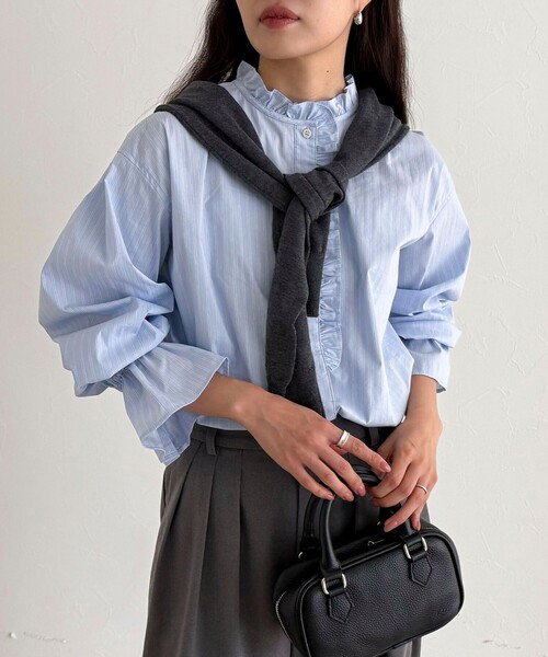 "◇fredy emue◇レイヤードにも映える上品フリルシャツ●point・襟元や前立てに施したフリルが、女性らしい華やかさと上品な印象をプラス・程よくゆとりのあるシルエットで、動きやすくストレスフリーな着心地・1枚ではもちろん、ニットやカーディガンとのレイヤードにも映えるデザイン・柔らかく肌触りの良いコットン素材で、季節を問わず着やすいのも魅力・カジュアルからきれいめ、オフィススタイルまで幅広く対応・デイリーにもお出かけにも活躍し、着回し力の高い万能アイテムです●STAFF着用コメント? 156cmスタッフ(38サイズ着用)ヒップにかかる丈感で、アウトでもインでもバランスよく着られました!軽くて柔らかい生地なのでごわつきがなく、ニットの中に着ても快適でした◎透け感:ややあり裏地:なし伸縮性:なし光沢感:なし洗濯:手洗い可◇商品のお気に入り登録◇気になる商品は、お気に入り登録がオススメです!クーポン情報、入荷情報が、通知されるようになります。※お手入れの際は、商品についている品質表示タグの取扱い表示をご確認ください。●お取扱い上のご注意●*商品を長くご愛用していただきたいため、アテンションタグがある場合は必ずご確認の上、着用又はお取り扱い下さい。*画像の商品はサンプルとなりますので実際の商品と仕様(主にファスナー・釦等の付属品)、加工、サイズが若干異なる場合がございます。*店頭及び屋外での撮影画像は、光の当たり具合で色味が違って見える場合があります。商品の色味は、スタジオ撮影の画像をご参照下さい。*商品画像に関しては出来る限り忠実に表示出来るよう努めておりますが、お客様がご利用のモニターの設定及び特性により、実際の商品と比較し色味に若干の誤差が生じる場合があります。*製品洗い加工の商品は、多少の歪み、シワなどが見られたり、風合いやサイズ等が1枚1枚異なります。汗や雨等で濡れた時や、摩擦により色落ちし、他の衣料を汚すことがありますので(特に濃色のもの)ご注意ください。※サンプルでの採寸のため、サイズ表はあくまで目安となります。予めご了承ください。"
