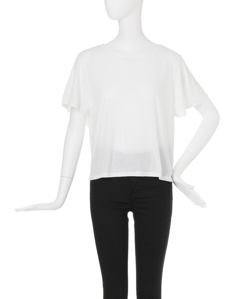 前と後ろでアシンメトリーになっているフリルスリーブが、トレンドのリラックスコーデにぴったり。とろみのある素材感がフェミニンさをプラスしてくれています。シンプルなデザインなのでネックレスなどでアクセントをつけるのがオススメ。