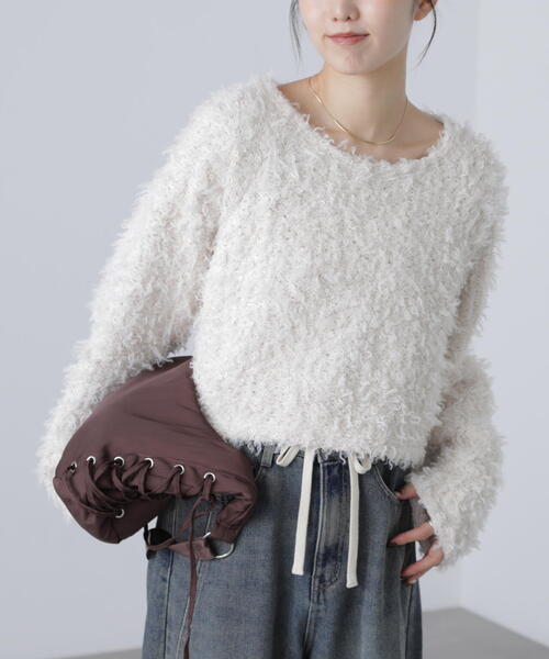 プードルのような毛足がウェーブした可愛らしい生地が特徴のニットソー。ニットソーなので、ニット特有の伸びや垂れを抑えながら着用いただけます。 オーバーサイズのクロップド丈で、ボトムスとバランスが取りやすいデザイン。 カジュアルな風合いのトップスなのでボトムスはデニムパンツやチノパンツがおススメです。 ※モデルの着用画像の場合、光の当たり具合により、実際の色味と異なって見えることがございます。色味は、商品単体の画像をご参照ください。 商品特性 ■透け感:なし ■生地の厚さ:厚手 ■裏地:なし ■伸縮性:なし ■光沢:なし ■シルエット:ビッグ --------------------------------------------------- ◆商品のお気に入り登録◆ お気に入りアイテムの値下げ・再入荷・在庫1点などの通知を受け取ることができます。 ◆ブランドのお気に入り登録◆ 新商品や再入荷、セール、クーポン配布などお得な情報を受け取ることができます。 ---------------------------------------------------