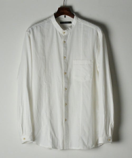 ワークシャツのディテールをデザインベースにしているスタンドカラータイプのシャツです。 ドビー織りという表面感のある生地を使用しています。 また細部では、ポケット裏やガゼット部分に生地の耳を使用しポイントにしています。