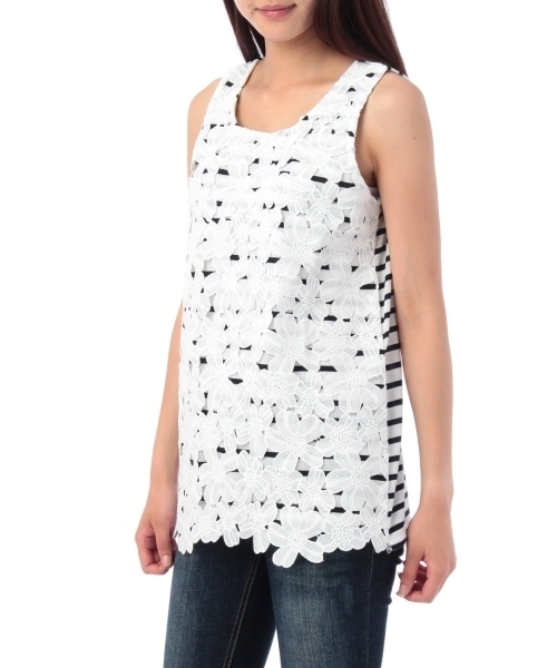 肌なじみの良さ、幅広ショルダーの安定感など、嬉しいポイントがたっぷり詰まったタンクトップ。フロント部分には大胆なフラワーレースをあしらうなど、カジュアルさの中に女性らしい繊細さが光る1枚です。メイン使いはもちろんのこと、カットソーなどとレイヤードしてチラリと覗かせるのも◎モデル情報:身長166cm B78W56H80 着用サイズ:02(M)店舗へのお問い合わせ商品番号:511-17325主に秋に着用いただける商品です。サイズスペック●製品寸法:02(M):総丈64 B86 肩幅2903(L):総丈66 B90 肩幅31