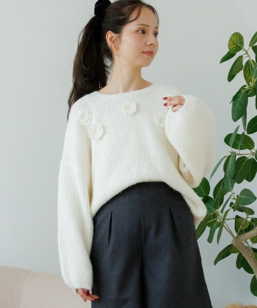 ■デザイン 立体のバラモチーフを散りばめた大人可愛いニット♡ flowerオリジナルのバラモチーフを付けた、 シンプルながらも存在感のある一枚です。 ゆったりしたシルエットなので、 ブラウスとのレイヤードもお楽しみいただけます。 ふわふわで柔らかい手触りの糸を使用している為、 着心地も抜群です。 ほどよい厚みで、肌寒い日も温かく着られます! わたあめのような優しいWhiteと、 こっくりとした大人可愛いGrayをご用意しました。 デイリー使いにはもちろん、デートにも♡ ■おすすめコーディネート feminine half pantsやfrill mini skirtなど、 ミニボトムスと合わせたフェミニンコーデがおすすめです。 snow flower denimやany baker pantsのような カジュアルなデニムパンツ合わせも◎ classic pleats blouse、classic frill blouseと合わせて レイヤードスタイルもお楽しみください♪ ■flower/フラワー 「love&joy」をコンセプトに、商品に愛を込め、 お客様に楽しんでいただけるような、 ナチュラルでガーリーなアイテムを提案していきます。 【お買い物を上手にお楽しみいただくためのPOINT2つ】 ◎ 購入ボタン横の ♡ (ハートマーク)をクリック! 完売カラーの再入荷通知、残り1点の通知、 セールの通知を受け取れます。 (クリックまたはタップで商品のお気に入り登録♪) ◎ ショップのトップページにある ♡ (ハートマーク) 「お気に入りショップに追加」をクリック! 新商品や再入荷等、いち早くブランドの お得な情報を受け取れます。 (ブランドのお気に入り登録♪)