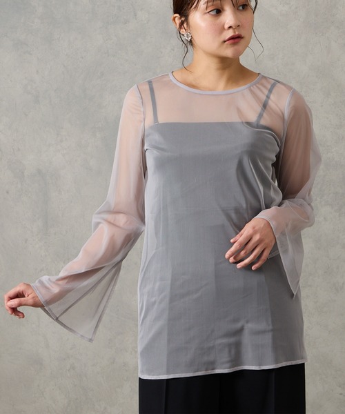 程よい透け感で合わせやすいインナーブラウス。シンプルながらも袖口の深めのスリットが抜け感を演出してくれるレイヤードスタイルに最適な1着です。■ポイント・高密度チュール素材を使用し、程よい透け感で上品な印象に・シンプルながらも上品さをプラスするフレアスリーブデザイン・開きすぎないボートネックで、様々なドレスにマッチ・ゆとりのある身幅で、動きやすく快適な着心地■ディテール・内側が抜けたスリット入りフレアスリーブ・ボートネックデザインでデコルテをきれいに見せる・バックネックはスリット開き+くるみボタンで着脱しやすく、ドレスを邪魔しないシンプルなデザイン・長めの着丈でインでもアウトでもスタイリングが可能■素材・高密度で透けにくいチュール素材・程よいハリとしなやかさを両立したチュールで、シルエットをきれいにキープ・襟ぐりの裏側にシフォンを配し、やさしい肌あたりに■コーディネート・ノースリーブワンピースにレイヤードしてセットドレス風に おすすめアイテム 品番:0323-5-15200、0323-6-01000、0323-0-81700・パンツやスカートを合わせて普段使いにも、カーディガンやジャケットのインナーとしても◎※照明の関係により、実際よりも色味が違って見える場合があります。またパソコン・スマートフォンなどの環境により、若干製品と画像のカラーが異なる場合もございます。予めご了承ください。